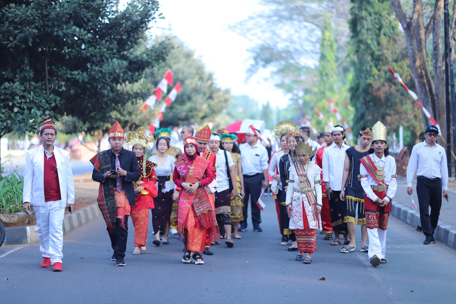 (Unila): Alunan musik lagu kebangsaan dan daerah menggema di sekitar kampus Universitas Lampung (Unila), Senin pagi, 18 September 2023. Pasukan drumband, penari, dan rombongan berbaju adat yang menampilkan kekayaan budaya daerah mengiringi ribuan mahasiswa Unila mengikuti Kirab Bendera Merah Putih.