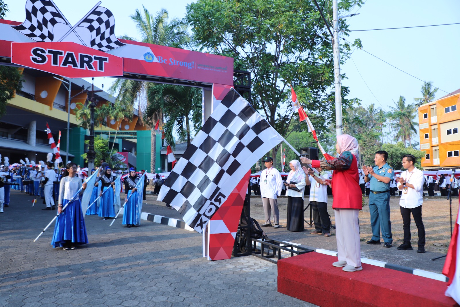 2.500 mahasiswa Unila peserta kirab terlihat bergerak mulai dari pelataran Gedung Serbaguna Unila. Setelah dilepas Rektor Unila Prof. Dr. Ir. Lusmeilia Afriani, D.E.A., IPM., ASEAN Eng., rombongan kirab berjalan serentak mengelilingi kampus dengan tertib dan kompak, melewati setiap fakultas yang ada di Unila.