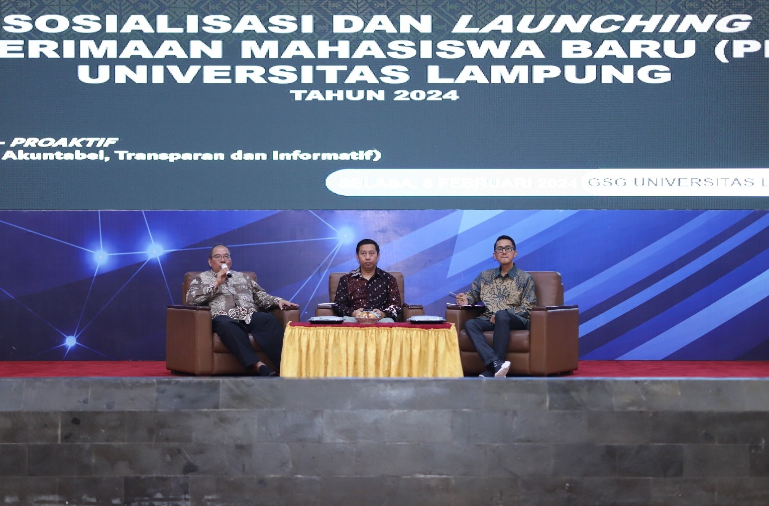 (Unila): Universitas Lampung (Unila) mengadakan sosialisasi dan launching penerimaan mahasiswa baru (PMB) tahun 2024 di Gedung Serbaguna Unila pada Selasa, 6 Februari 2024.