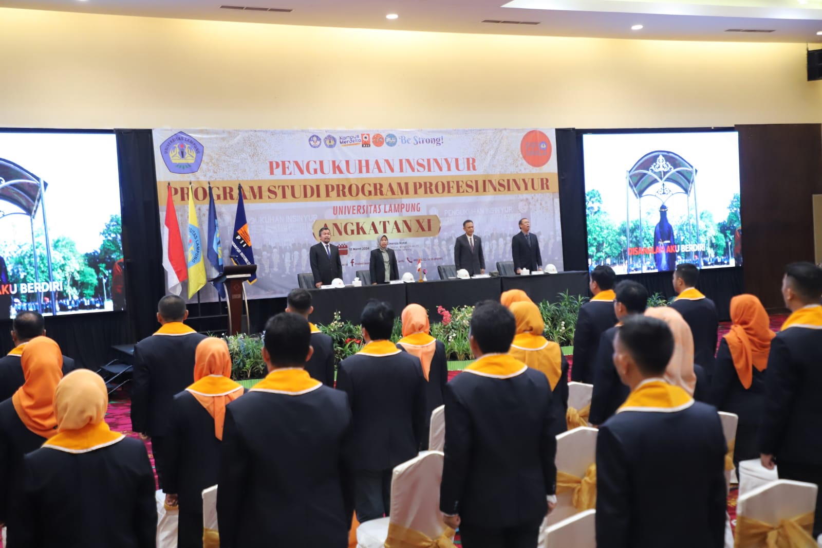 (Unila): Program Studi (Prodi) Program Profesi Insinyur (PSPPI) Universitas Lampung (Unila) menggelar upacara pengukuhan 58 insinyur angkatan XI, di Emersia Hotel, Minggu, 10 Maret 2024.