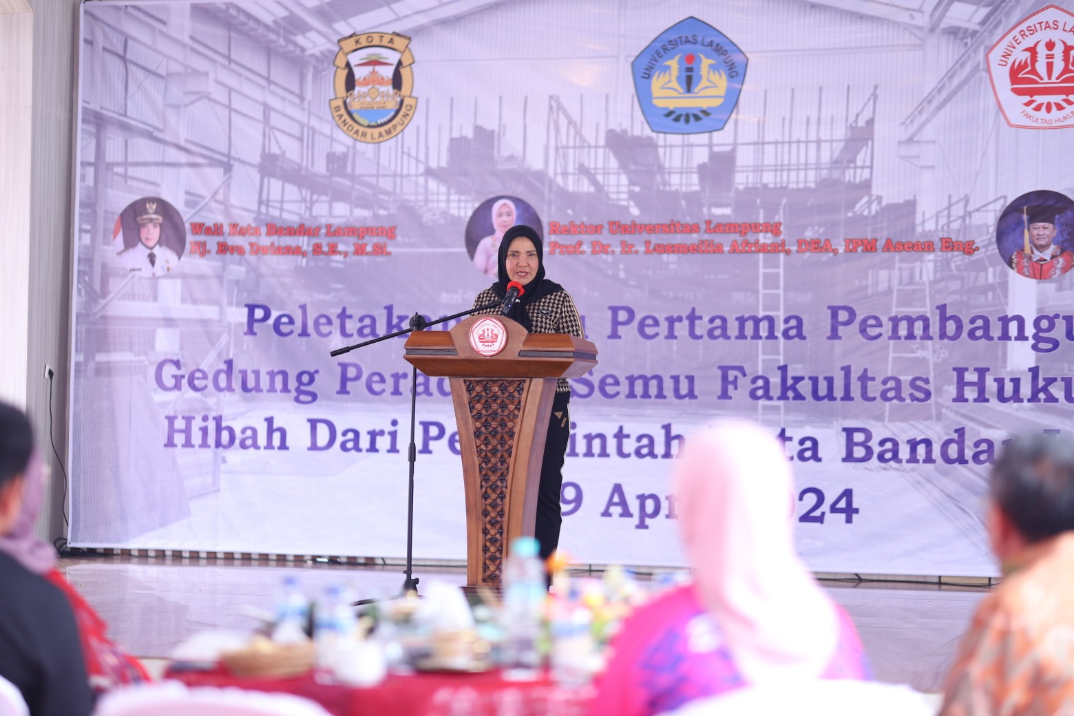 Rektor Unila Prof. Dr. Ir. Lusmeilia Afriani, D.E.A., IPM., ASEAN Eng., mengapresiasi Pemerintah Kota Bandar Lampung melalui Wali Kota Eva Dwiana yang telah membantu mewujudkan pembangunan Gedung Peradilan Semu guna meningkatkan sarana pembelajaran mahasiswa FH Unila.