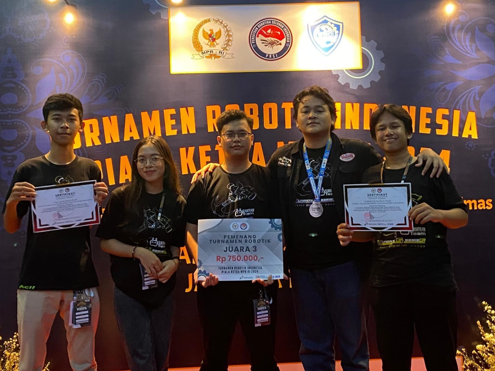 (Unila): Dafa Sitanala Putra Baladiah (Teknik Informatika’18) dan Nayaka Adiwidya Putra (Teknik Elektro’24) dari Universitas Lampung (Unila), meraih juara tiga dalam Turnamen Robotik Indonesia Line Follower Mahasiswa atau Umum Piala Ketua MPR RI, di Gor Padepokan Pencak Silat TMII, Jakarta Timur, 17-19 Mei 2024.