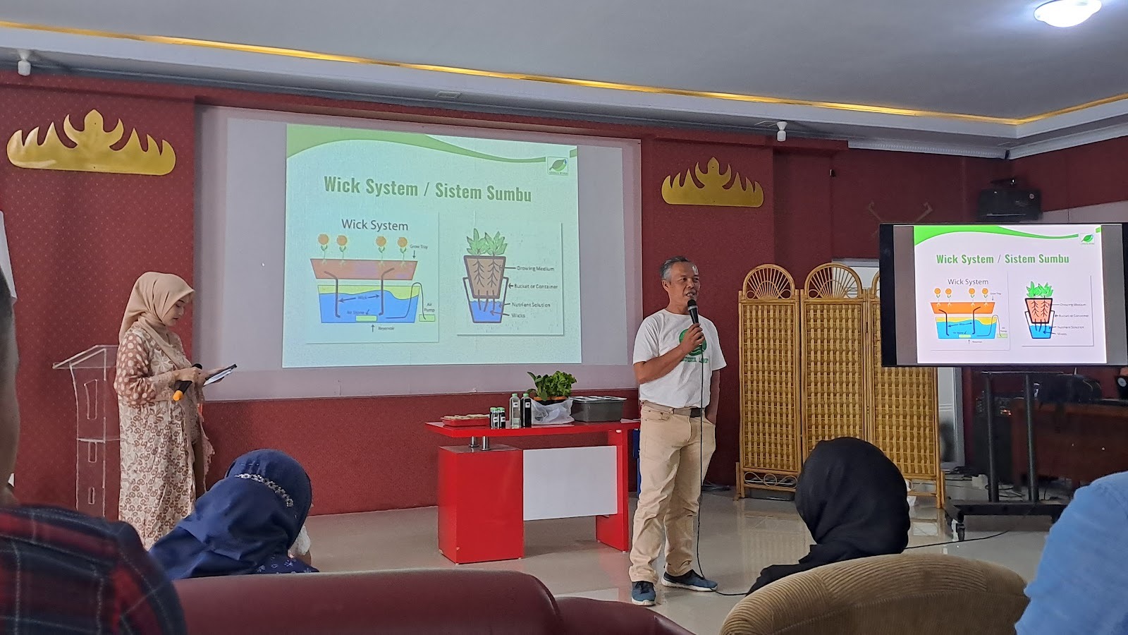 Penyelenggara menghadirkan dua narasumber berpengalaman di bidangnya, yaitu Merylia, S.T., M.T., selaku Fungsional Perencanaan Bappeda Provinsi Lampung dan Wahidin selaku Owner dan Praktisi Hidroponik Lampung.