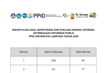 Ketua PPID Unila Prof. Dr. Ayi Ahadiat menyampaikan, monev internal wajib diikuti dengan sungguh-sungguh oleh PPID Pelaksana untuk mendukung keterbukaan informasi publik. Hasil monev internal akan dijadikan dasar untuk menentukan peringkat keterbukaan informasi unit kerja di Unila.