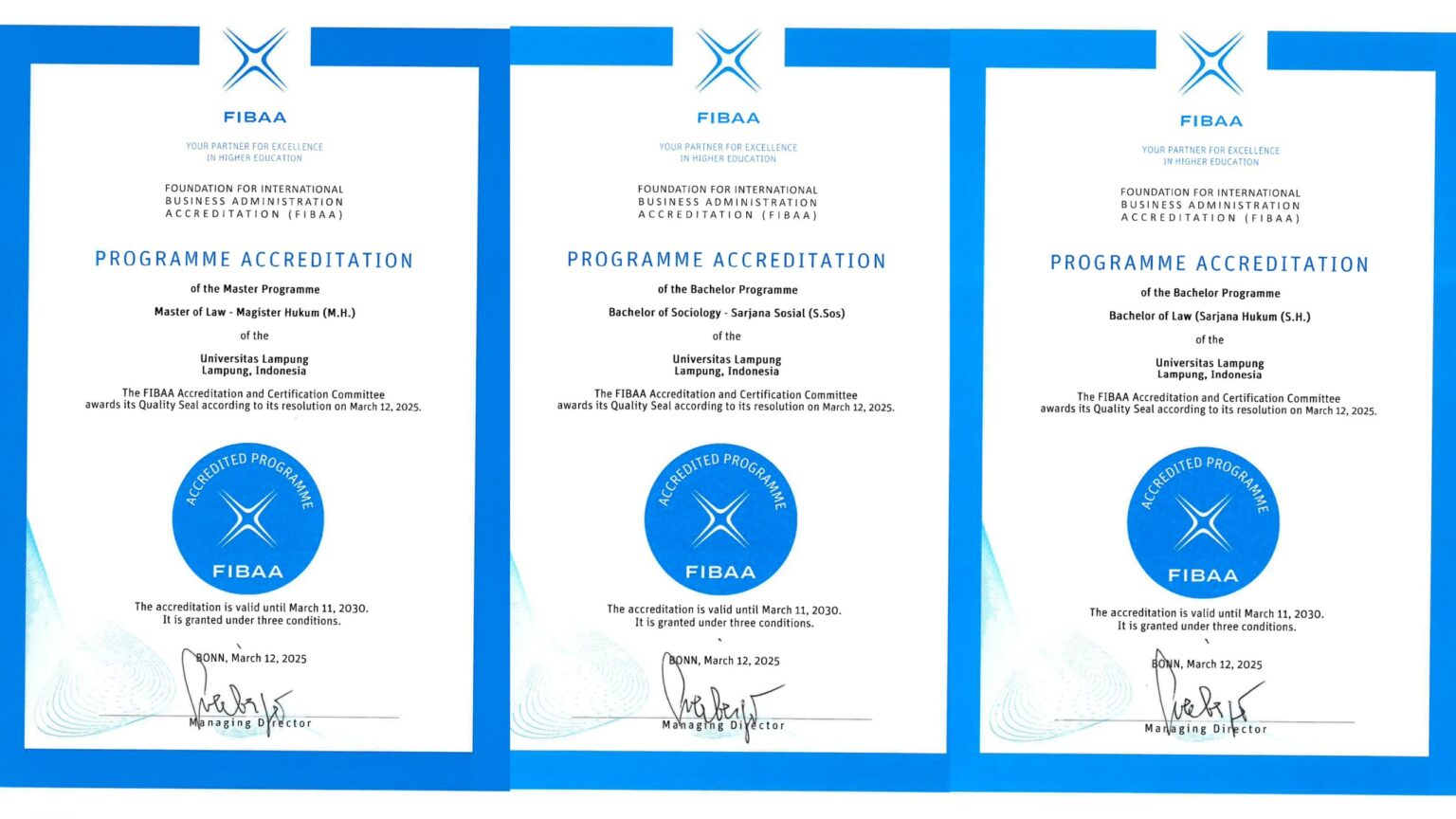 Seluruh ketetapan tersebut disahkan melalui resolusi Komite Akreditasi dan Sertifikasi FIBAA pada 12 Maret 2025 di Bonn, Jerman, yang ditandatangani langsung Direktur Pelaksana lembaga tersebut.